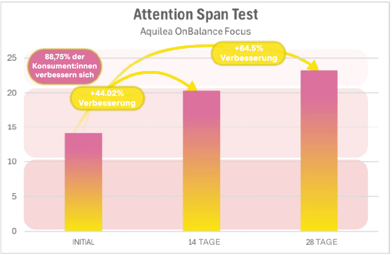 Nach der Einnahme zeigten sich eine durchschnittliche Steigerung von 44,02 % in den ersten 14 Tagen und eine durchschnittliche Steigerung von 64,5 % am Ende derAnwenderbefragung, was einer guten Aufmerksamkeitsspanne entspricht.